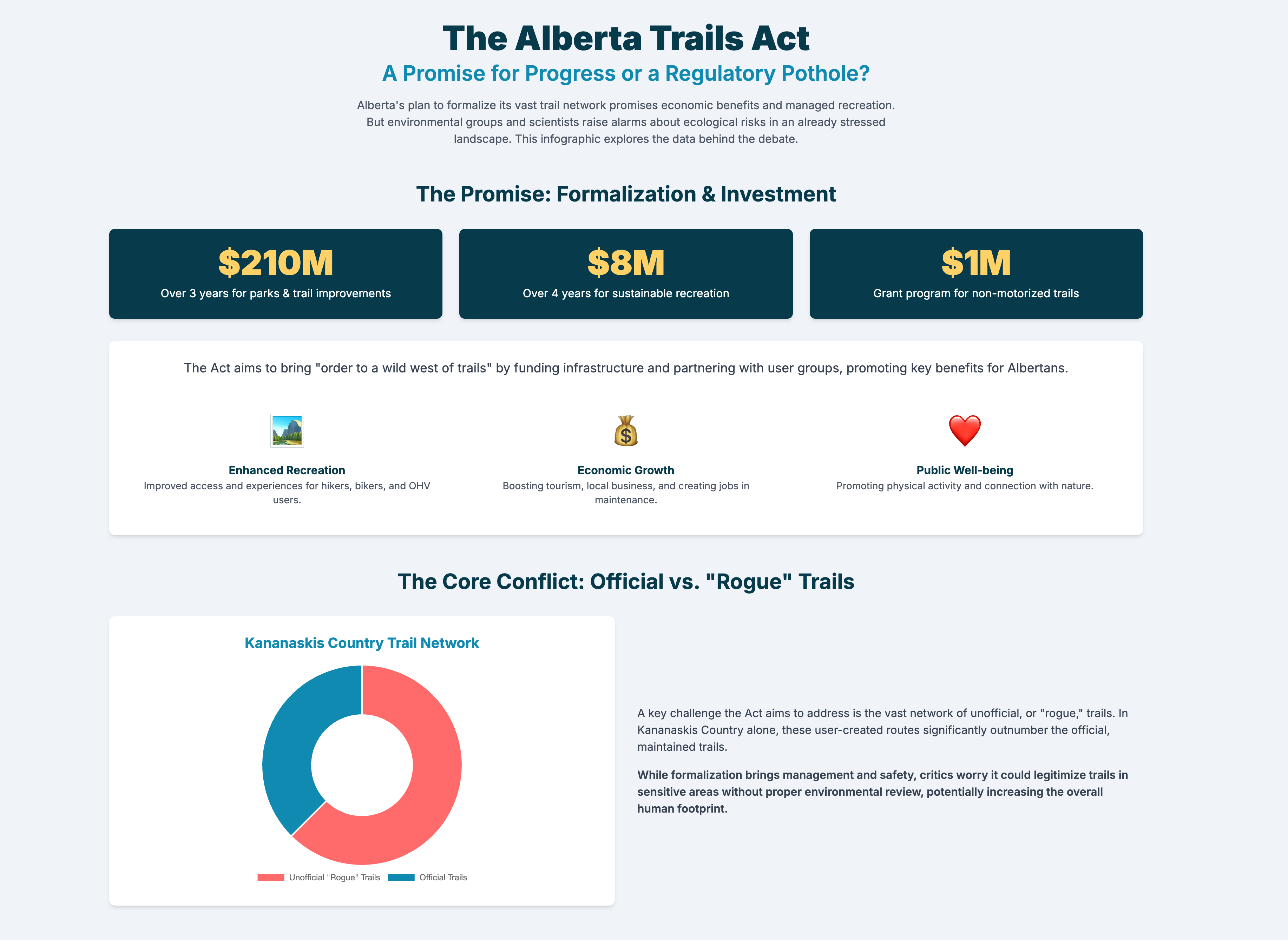 The Alberta Trails Act represents both an opportunity and a risk. While it provides a framework for trail management, it risks becoming a regulatory pothole if it continues to overlook ecological integrity and community voices. Authentic stewardship—rooted in sustainability, equity, and inclusivity—will be essential for ensuring Alberta’s trails serve both people and the environment for generations to come.