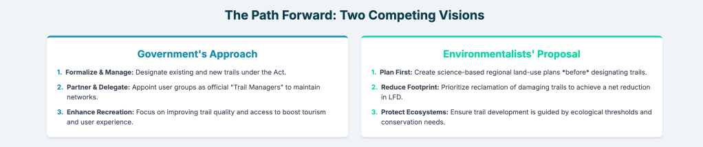 Equally concerning is the lack of meaningful public and Indigenous consultation. By sidelining these voices, the Act risks missing opportunities for community-driven stewardship that could ensure long-term sustainability. In the absence of robust policy, grassroots organizations and non-profits continue to shoulder the burden of trail maintenance, education, and advocacy—often with limited resources.